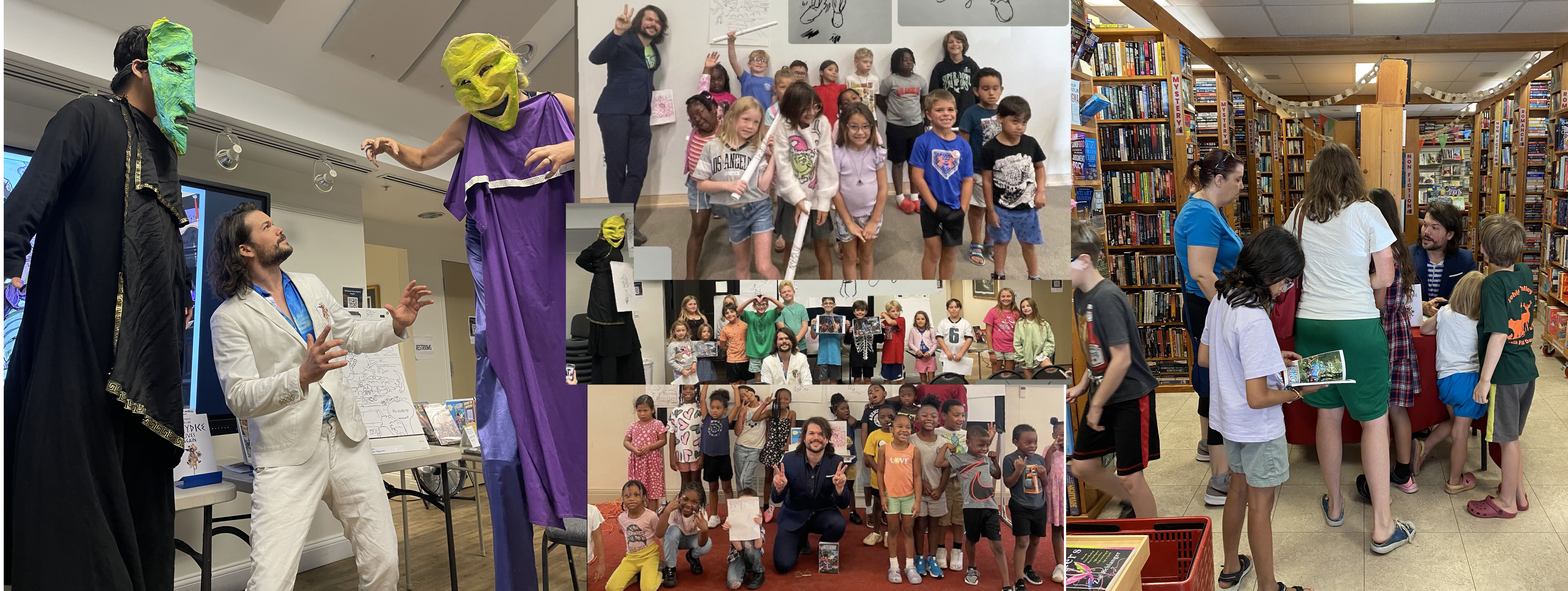 Extending a warm thank you to the Delaware Division of Libraries and the Institute of Museum and Library Services for having me on as their Summer Performer. Also thanks to the Hockessin Bookshelf, The Crafty Reader, and Blue Hen Comic Con for hosting, and to all the patrons who came to listen to me speak on some of the myths I've helped craft across Percy Jackson, Heroes of Olympus, and the Kane Chronicles. And cheers to the hundreds of demigods who posed for portraits and wielded swords, tridents, or bows (see the GIF at bottom left). Want me at your library or school? Inquire at: orpheus@orpheusartist.com. (Giants not gauranteed.)